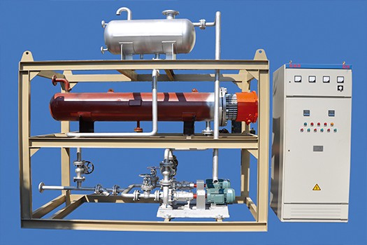 以導熱油作為熱載體,進入流態型電加熱器進行加熱,經過高溫循環泵的輸送,強迫導熱油 進行液相循環,將熱量傳遞給一個或多個用熱設備,經用熱設備換熱后,熱載體又回到電加熱器進行加熱,然后又傳遞給用熱設備的循環過程,通過以上的循環流 程,故來實現熱量的連續傳遞,使被加熱物體溫度升高,達到加熱的工藝要求。